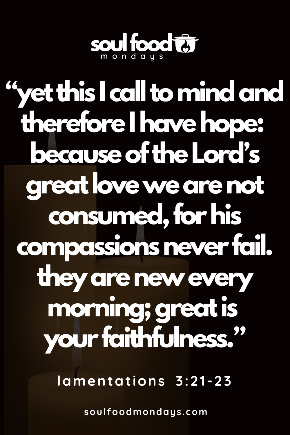 “Yet this I call to mind and therefore I have hope: Because of the Lord’s great love we are not consumed, for his compassions never fail. They are new every morning; great is your faithfulness.”